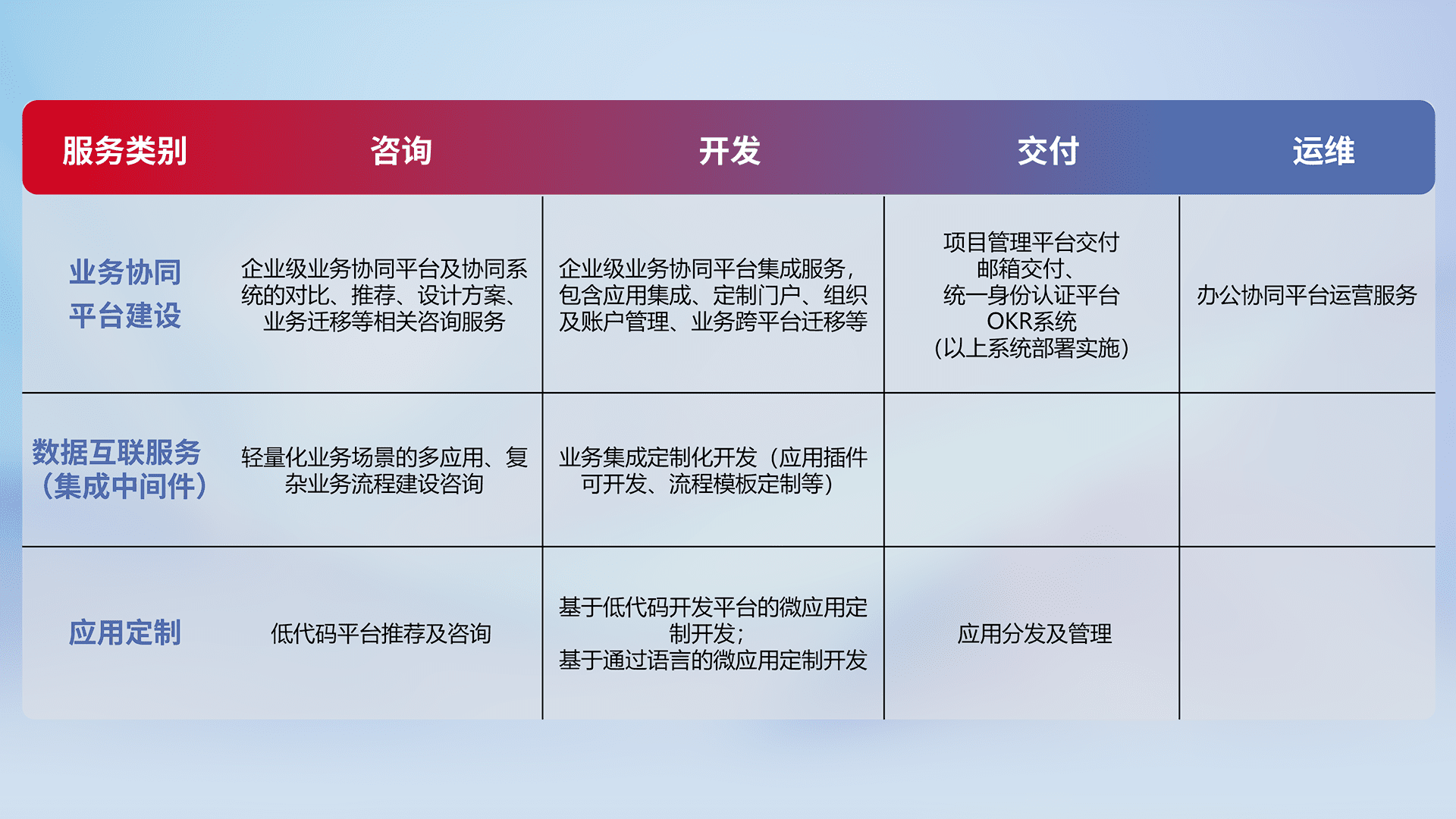 针对钉钉、、、、企微、、、、IDaas等平台级产品提供产品的规划、、、方案、、、交付、、、定制化开发等服务,,,实现如统一协同办公、、、、智能客户服务、、、、混合会议管理、、、、智能数据查询、、、等业务场景,,,,实现数字化转型。。